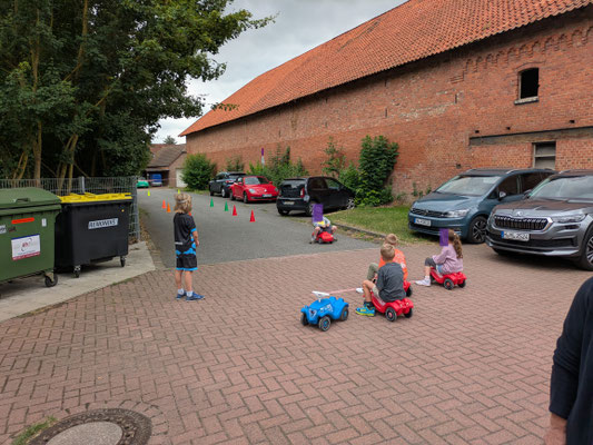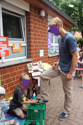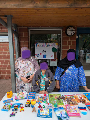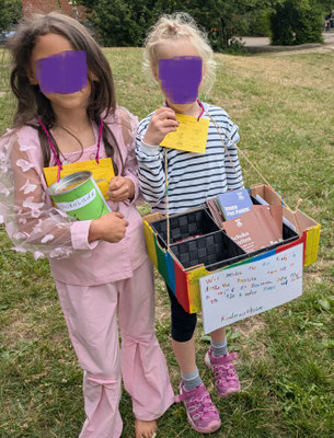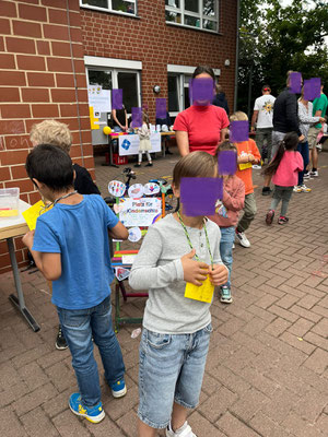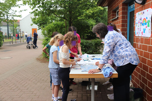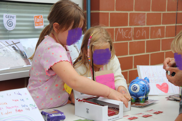 Zu Spiel, Spaß, guter Laune und zum Spenden luden verschiedene Aktivitäten ein: ein Schuhputzstand, ein Tauschflohmarkt, eine Secondhand-Tombola, ein Stand 'Taschen aus T-Shirts', das Bobbycar-Rennen, Buttons zum Selbermachen, ein Blumen-Pflück-Spiel, ein Schokokuss-Wurf-Spiel sowie ein Waffelstand, ein Bauchladen-Verkauf mit "Fair-trade-Schokolade" und ein riesiges leckeres Buffet mit süßen und herzhaften Leckereien.