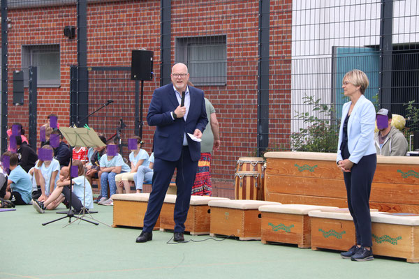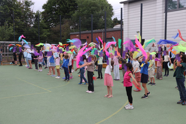 Das Fest begann mit einer feierlichen Eröffnung. Nach einem Tüchertanz der Kinder folgte eine Rede unserer Schulleiterin Frau Kopp gemeinsam mit dem Kinderparlament sowie Frau Tacke und Frau Staack. Im Anschluss hielten unsere Unicef-Teamerinnen Frau Loest-König und Frau Teichmann eine kurze Ansprache und überreichten das offizielle Zertifikat 'Kinderrechte-Schule'. In einer freundlichen Rede beglückwünschte Herr Baumgarte als Vertreter der Stadt Hemmingen schließlich Frau Kopp und das Kollegium zum Geburtstag und zur Zertifizierung. Mit einem Lied endete der offizielle Teil der Feier.
