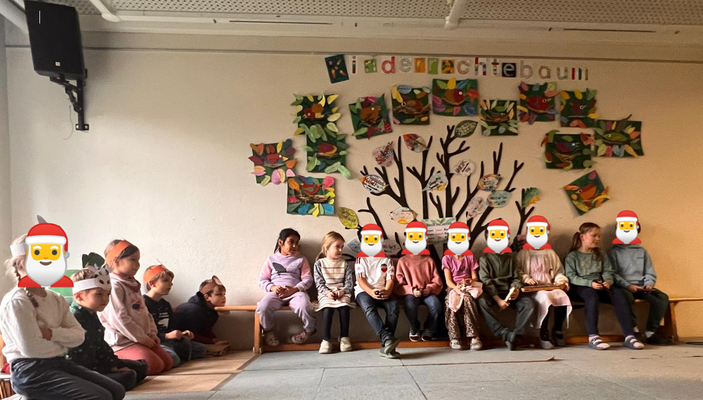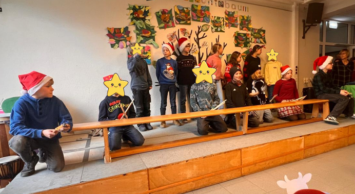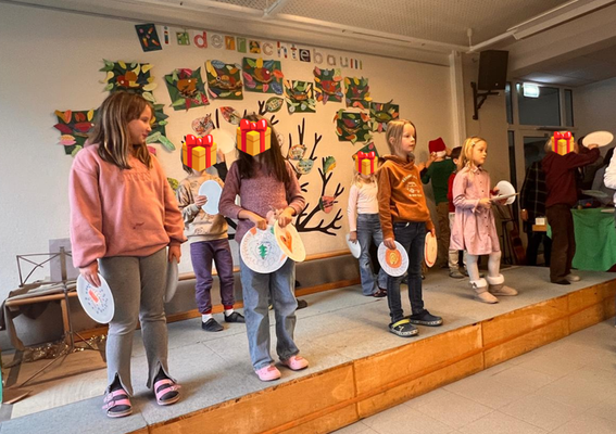 Am letzten Schultag vor den Weihnachtsferien fand auch in diesem Jahr wieder unser Weihnachtsforum statt. In der Adventszeit hatten alle Klassen mit viel Einsatz geprobt und ein vielseitiges Programm vorbereitet. Zu sehen waren verschiedene Lieder, Tänze, ein Gedicht sowie das kleine Theaterstück vom Weihnachtshasen. Viele Beiträge wurden musikalisch begleitet, zum Beispiel mit Orff-Instrumenten, Stabspielen oder Drumsticks und passenden Bewegungen. Auch Tschaikowskys „Nussknacker“ war gleich zweimal vertreten: Der „Trepak“ wurde als kreativer Tellertanz aufgeführt und der „Tanz der Zuckerfee“ als Body Percussion umgesetzt.